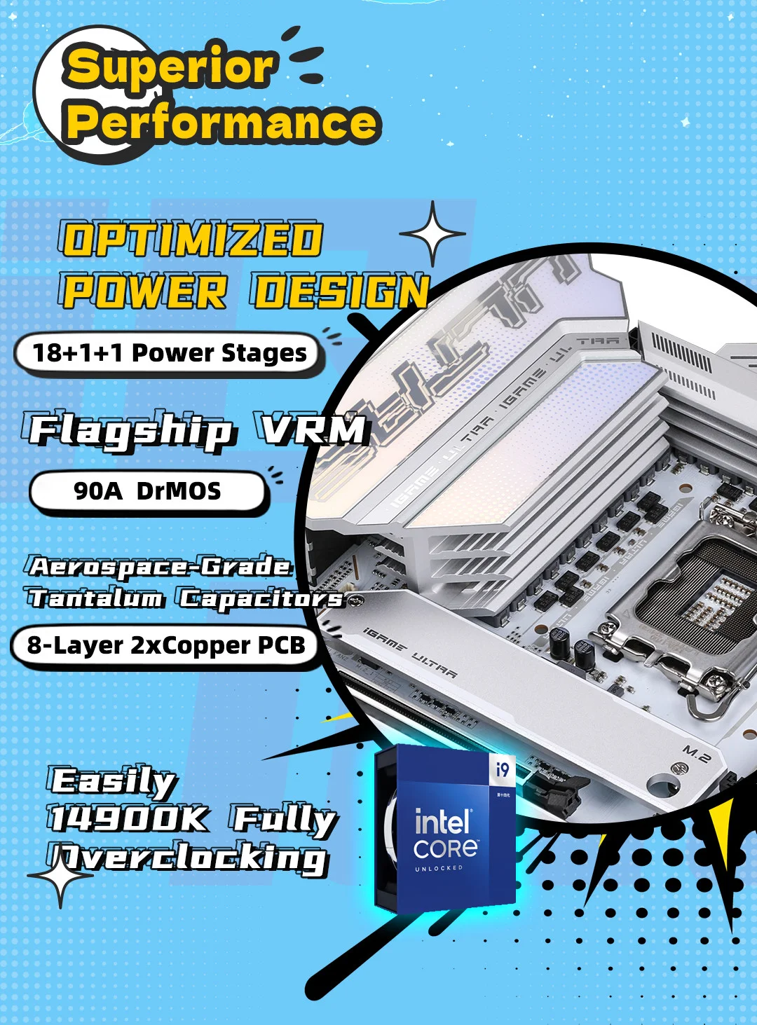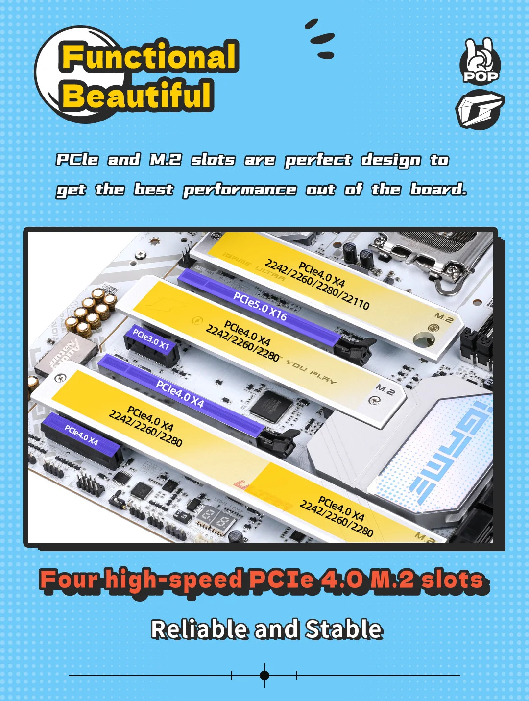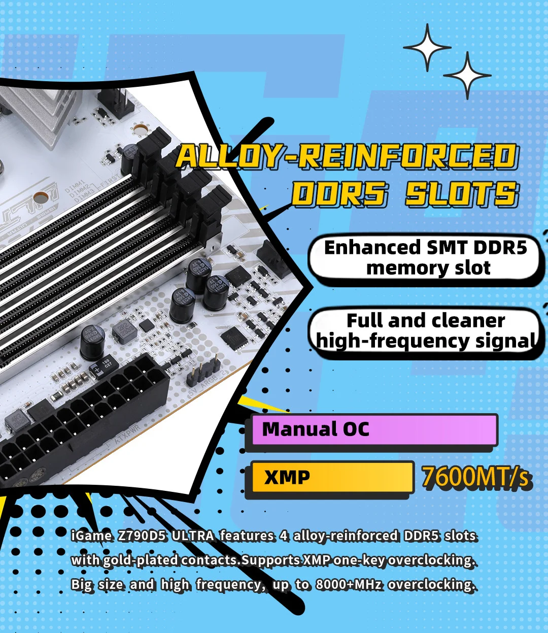 iGame Z790D5 ULTRA, altın kaplamalı kontaklara sahip 4 alaşımla güçlendirilmiş DDR5 yuvasına sahiptir. XMP tek tuşla hız aşırtmayı destekler. Büyük Boyut ve yüksek frekans, 8000+MHz'e kadar hız aşırtma.