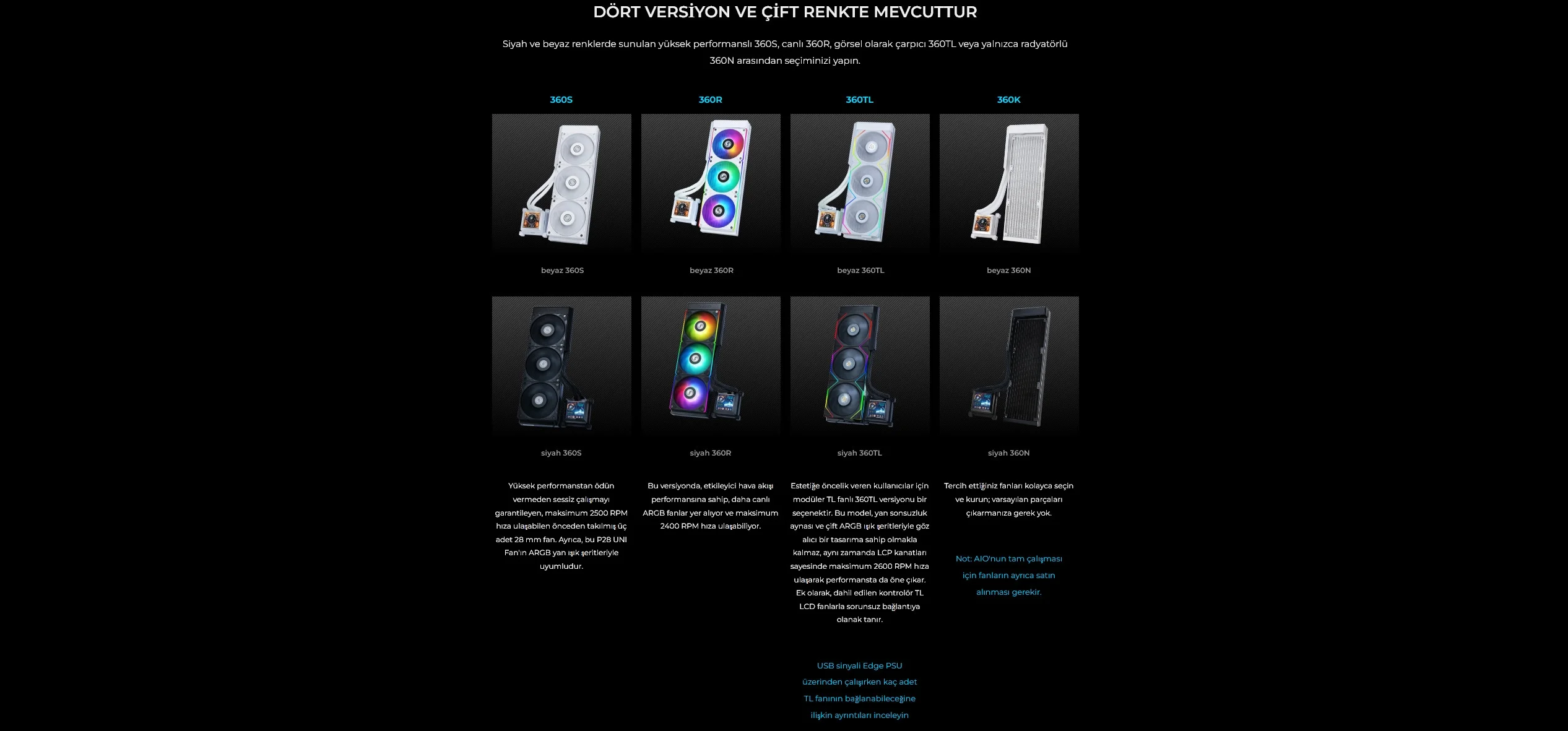 Siyah ve beyaz renklerde sunulan yüksek performanslı 360S, canlı 360R, görsel olarak çarpıcı 360TL veya yalnızca radyatörlü 360N arasından seçiminizi yapın.