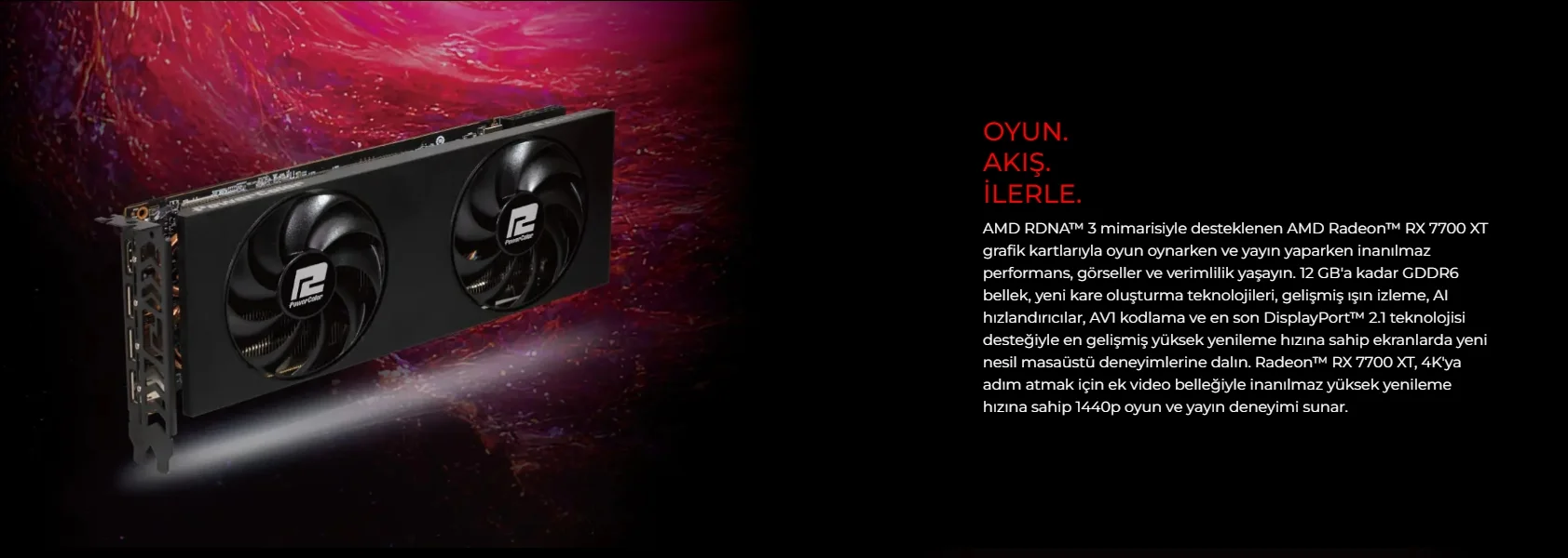 AMD Radeon™ RX 7700 XT grafik kartları oyuncular için yeni bir performans seviyesi belirliyor. 12 GB'a kadar GDDR6 bellek, birleşik AMD RDNA™ 3 hesaplama birimleri ve 1440p'de ultra hızlı, ultra akıcı oyun performansı ve 4K'da ultra ayrıntılı grafikler deneyimleme esnekliği sağlayan yeni nesil özellikler sunuyor. AMD Radiance Display™ Motoru ve DisplayPort™ 2.1 ile kendinizi daha da kaptırın ve video oynatma için 68 milyara kadar renk ve 8K'ya kadar destek deneyimleyin.